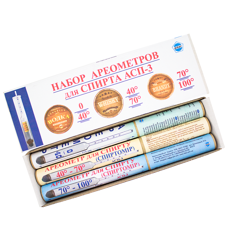 Цей набір ареометрів ідеально підходить для проведення вимірювань об'ємної частки етилового сп-ту в різних водних розчинах.