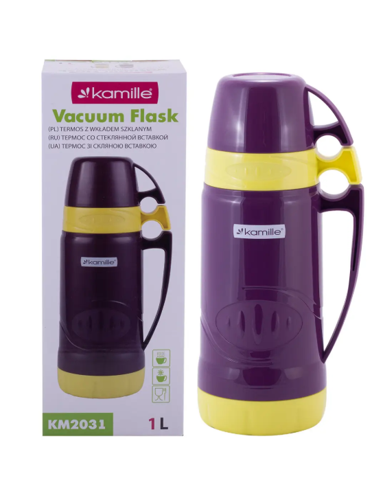 Термос 1000 мл зі скляною колбою Kamille пластиковий, 2 чашки
