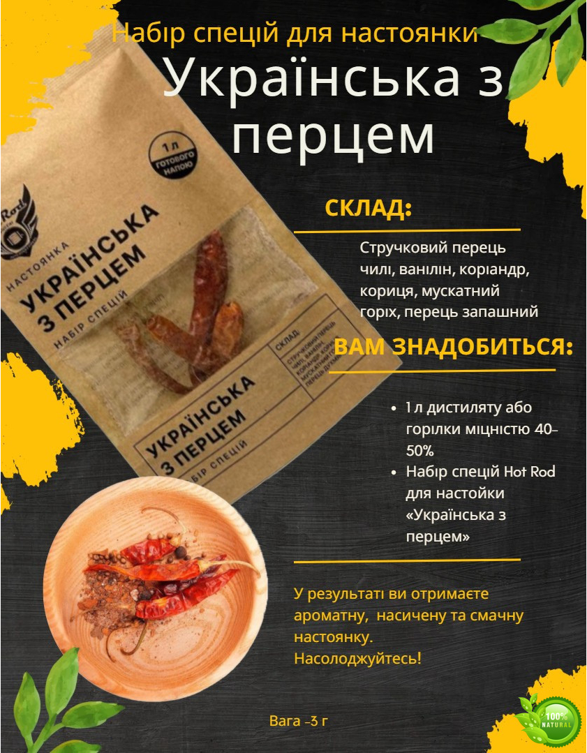 Подарочный набор специй для настоек «Украинские настойки» - это идеальный выбор для тех, кто ценит уникальные вкусы и хочет попробовать себя в создании ароматных домашних настоек. В набор входят 10 различных смесей специй, каждая из которых предназначена для приготовления 1 литра напитка, что позволяет вам создать до 10 литров удивительных настоек, которые порадуют вас и ваших гостей.