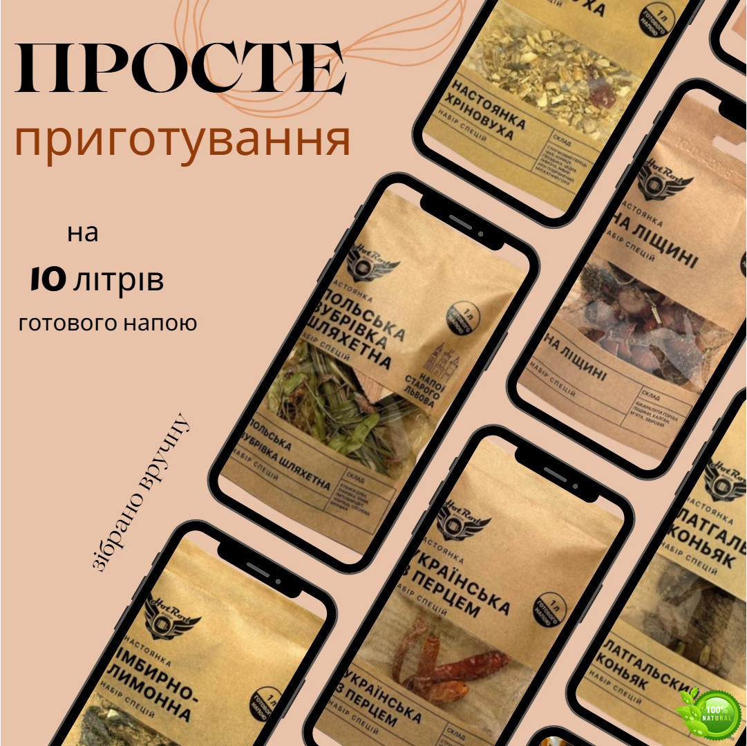 В комплект входит 10 тщательно подобранных смесей специй, каждая из которых рассчитана на приготовление 1 литра напитка. В целом набор позволяет создать до 10 литров уникальных настоек, ликеров или ароматизированных крепких напитков в домашних условиях.