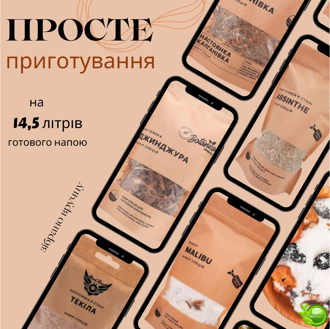 Цей набір створений для приготування ароматних настоянок і лікерів у домашніх умовах. До комплекту входить 5 унікальних смакових міксів, натхнених популярними світовими напоями, що дають змогу приготувати до 14,5 літра готового продукту. Ви легко зможете перетворити звичайний дистилят на вишуканий напій із багатим смаком і насиченим ароматом — без хімії, барвників і зайвих домішок.