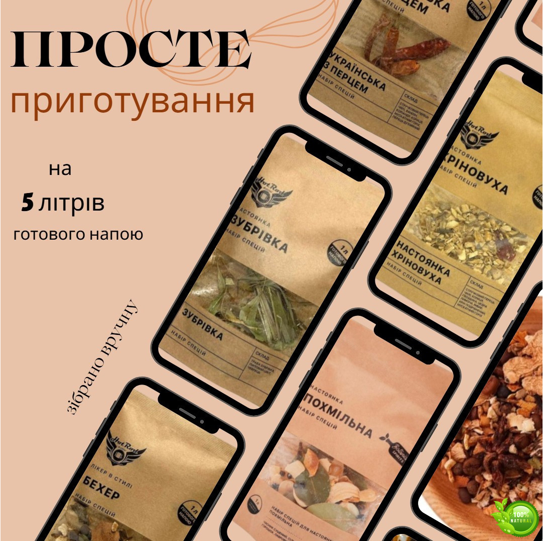 У наборі зібрано 5 ретельно підібраних сумішей спецій, трав та ароматних добавок, кожна з яких призначена для приготування 1 літра напою. Загальний об'єм — до 5 літрів готових настоянок і лікерів. Завдяки збалансованим рецептарам ви легко зможете отримати насичений аромат, глибокий смак і приємний посмак без використання штучних ароматизаторів або барвників.